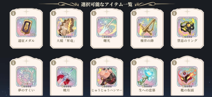 一部の「モチーフ装備」や遠征メダルを獲得可能です。特にモチーフ元のキャラを大きく強化する装備となるため、キャラ所持状況によりどの装備を選択するか決めましょう。