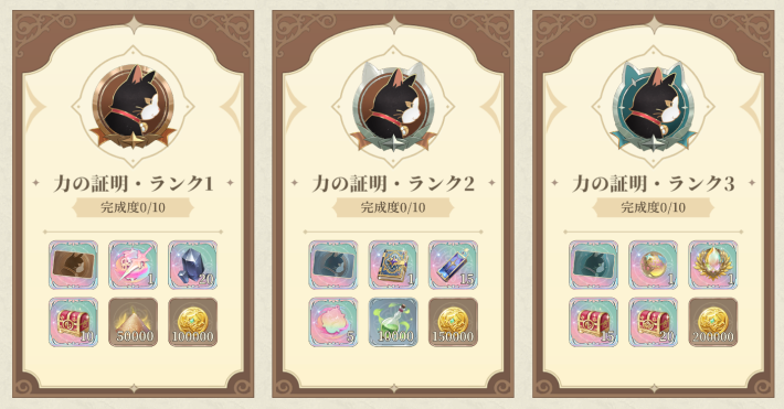 各ステージの初回クリア報酬の他、ランクの全ステージをクリアすることで「証明報酬」を獲得できます。プロフィール報酬や強化アイテムなど様々な報酬が含まれているため、獲得を目指しましょう。