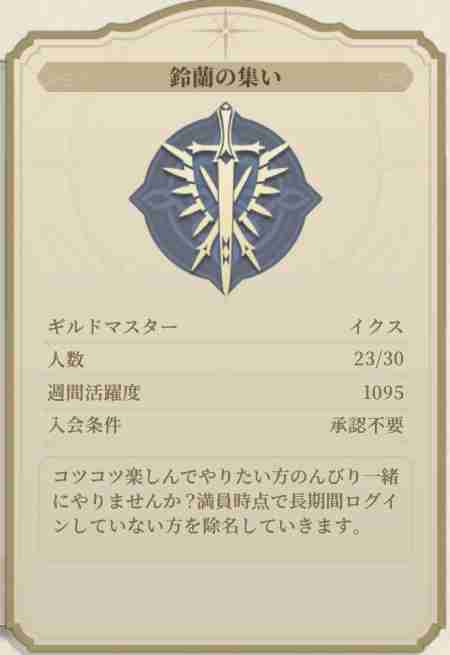 ・ギルドが定員に達して入れない:私のID「770026142」に「ギルド未所属」の状態でフレンド依頼を下さい。登録後にその旨お伝えくだされば入隊予約の形を取ります。除名後に再入隊したい方も同じ方法を取って下さい