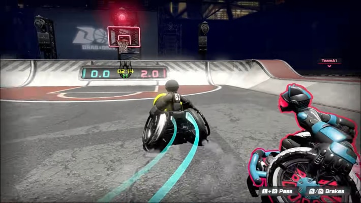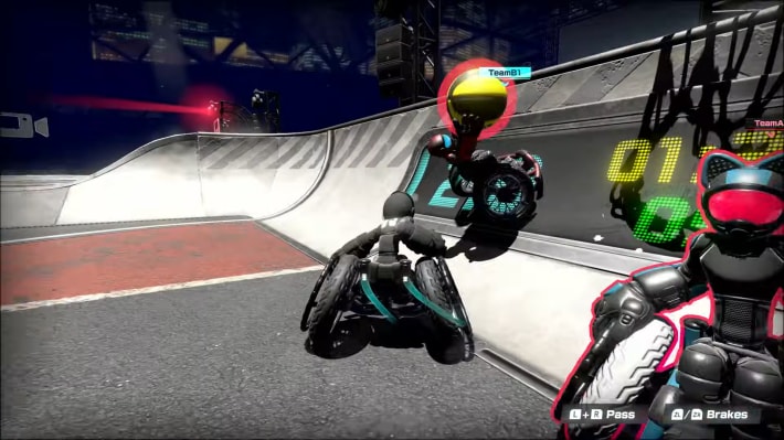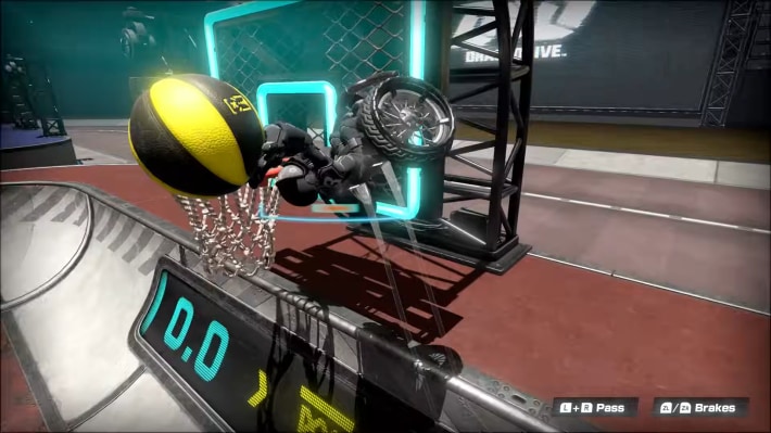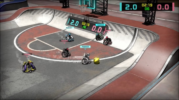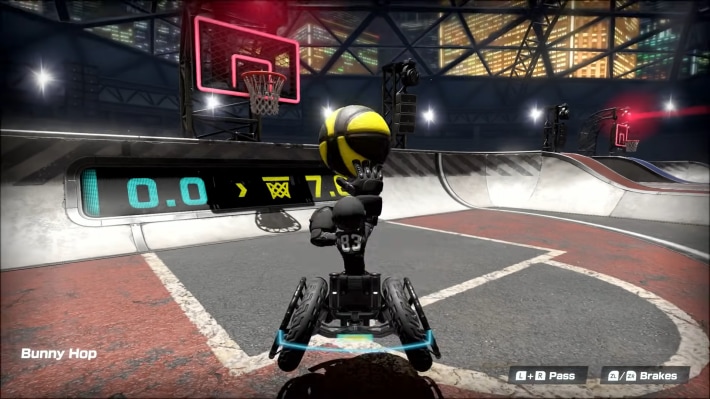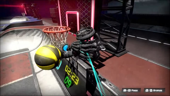 2つの車輪を操作しながらコート内を駆け回り、バスケットボールのようにボールをシュートしてゴールに入れることができたらポイントを獲得できます。試合時間は3分です。