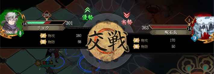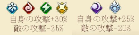 有利属性で攻撃すると氷・火・雷・光は攻撃力が30%上昇し、敵から受けるダメージが25%減少します。幽と闇はこの4属性と比べるとダメージ増減が5%低くなります。