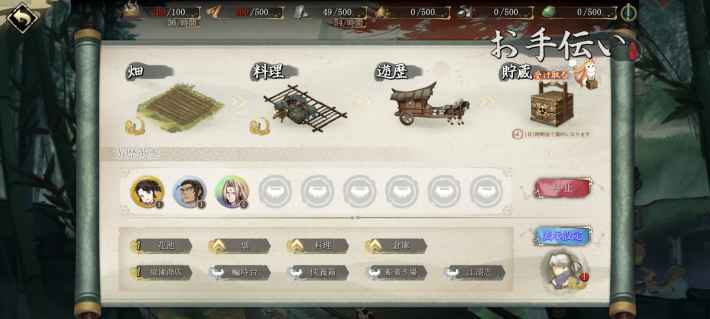 お手伝いでは、託管(遊歴)機能によって時間経過でアイテムが手に入ります。それぞれの建物の画面にもお手伝いから遷移できるため、庭園の大部分をお手伝い内で完結することができます。