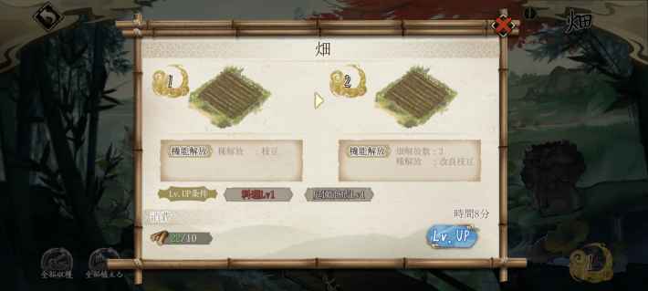 畑のレベルを上げると、植えることができる畑のスロットが増えます。また新しい種も開放されるため、より多くの種類の野菜を獲得できるようになります。