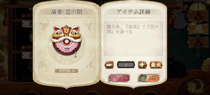 新しい曲は庭園商店で、方銭と交換することで追加していくことができます。「演奏」と曲名の前についているものが対象で、「BGM」の曲を購入しても演奏とは異なるため注意しましょう。