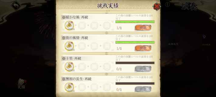 特定の曲の演奏を完了すると、実績報酬として銅銭が貰えます。スコアなどの条件は無く、曲を最後まで聞くだけで実績達成となり報酬を受け取ることができます。