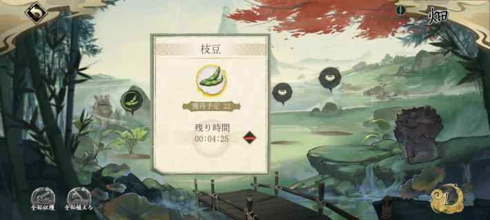 畑に種を植えることで、料理に使用する野菜を獲得できます。種ごとに指定された時間が経過することで収穫可能となります。
