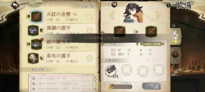 装備の強化上限はキャラレベルを上げることで解放されていきます。素材が揃っていても強化できない場合は、まずはキャラのレベルをアップさせていきましょう。