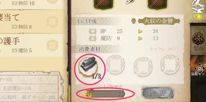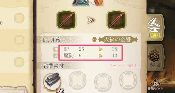 装備のレベルが上がることで、装備の部位ごとに定められたステータスが増加します。一度上げたステータスは恒久的に強化されるため、積極的にレベルアップしていきましょう。