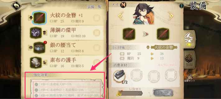4個所の装備全てを+3/+6/+9まで上げると、装備のステータスとは別に強化効果が発動します。強化効果はステータスの増加量が高いため、装備強化の際は強化効果の発動を狙って上げていきましょう。