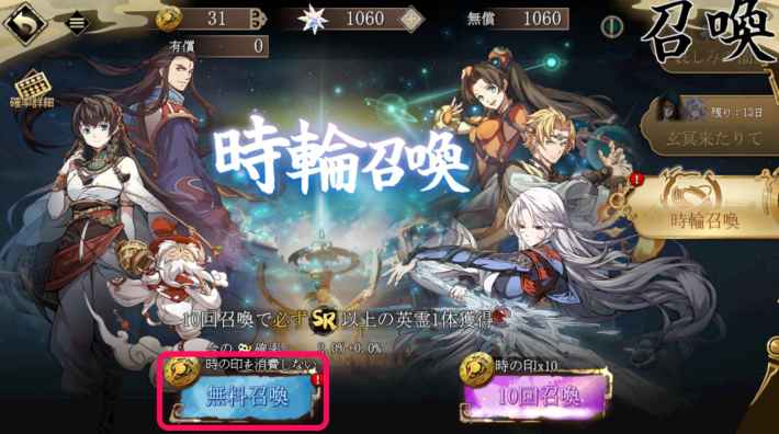 1日1回の無料ガチャ(召喚)を引きましょう。無料ガチャの回数は毎朝5時リセットされ、翌日に持ち越すことはできないため、毎日忘れず引きましょう。