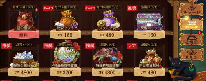 商店に無料で購入できるパックと毎日1回限りの限定パックがラインナップしています。毎日1回購入できるパックは7日分を一括購入することができ、まとめて購入することでお得に入手できます。