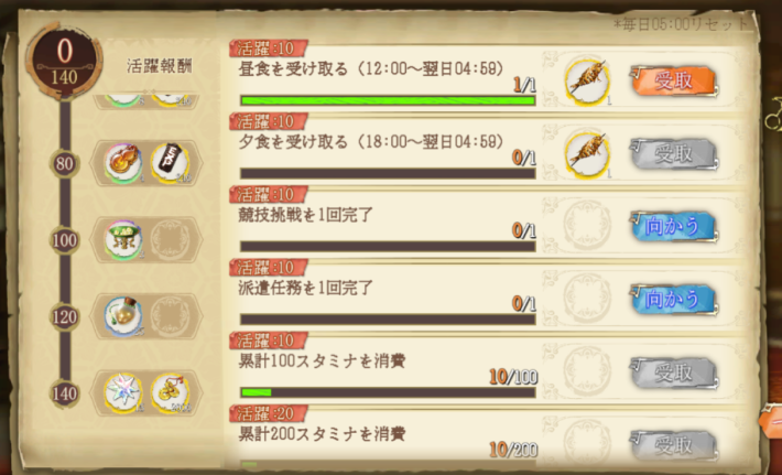 スタミナは1日5回まで回復できることに加え、デイリー任務で手に入る「焼き魚」でも回復することができます。