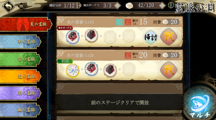 霊脈の淵の主な報酬は武器の強化素材です。キャラの属性ごとにステージが分かれており、出現する敵の属性が偏っているため、弱点属性で編成を組むことを意識しましょう。追加報酬がもらえる毎日ボーナスは1日当たり3回です。