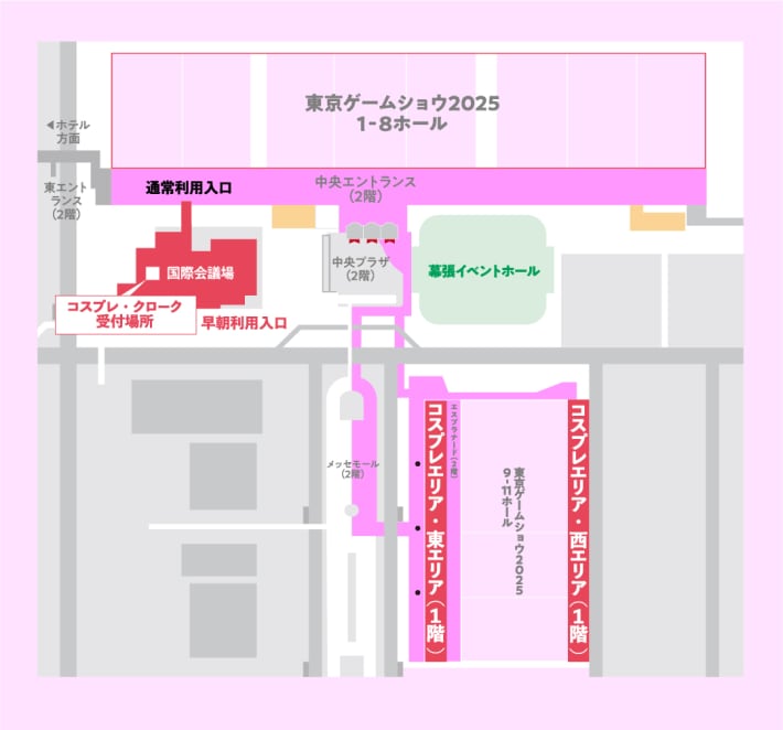 コスプレ更衣室の早朝開放もされており、朝の入場前に着替えることができます。早朝利用時と通常利用時で国際会議場への入場口が異なるため注意が必要です。