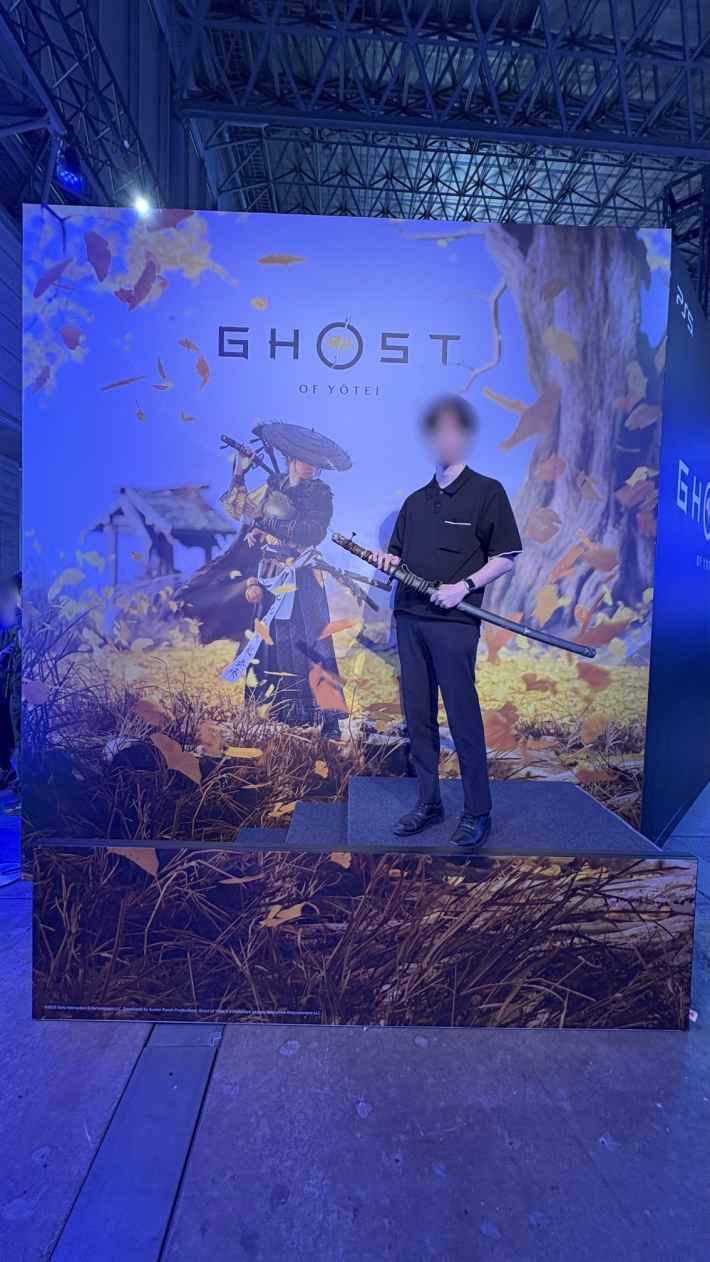 フォトスポットでは、『Ghost of Yōtei』のビジュアルを背景に、刀を持って写真撮影が可能です。