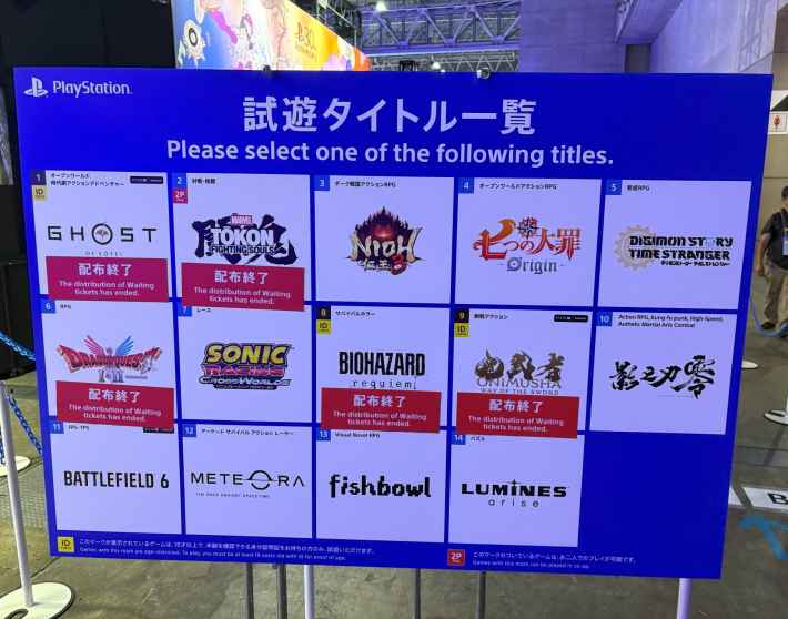 プレイステーションブースでは複数の注目タイトルが試遊できますが、1タイトルあたりの試遊台数は多くありません。そのためビジネスデイ初日の整理券は、ほとんどのタイトルが13時ごろには配布終了していました。